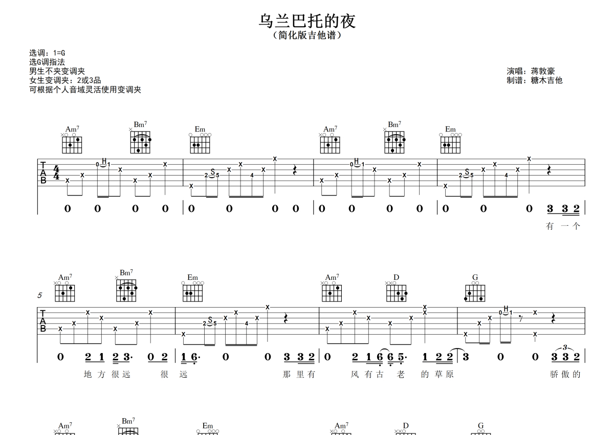 《乌兰巴托的夜》是蒋敦豪演唱的一首歌曲,拍号为4/4拍,歌曲原调为G调,本吉他谱采用的是G调指法编配,演奏时不需要使用变调夹即为原调,这份吉他谱共有三张高清图谱,图谱由 @糖木吉他 编配上传,图谱使用六线谱编配,包含吉他和弦指法、简谱以及歌词部分,使用这份乌兰巴托的夜吉他谱,可以让你更加方便地掌握这首歌曲的弹唱技巧,快来尝试吧。对新手超友好的简化版吉他弹唱谱《乌兰巴托的夜》 蒋敦豪G调指法版 谱曲对应视频示范以及音频示范都可在抖音搜索(糖木吉他)观看 想要更多吉他谱,可在抖音和小红书搜索关注“糖木吉他” 或者添加老师微信“Tangmu2867 ”来获取更多简单弹唱的吉他谱和弹唱视频。