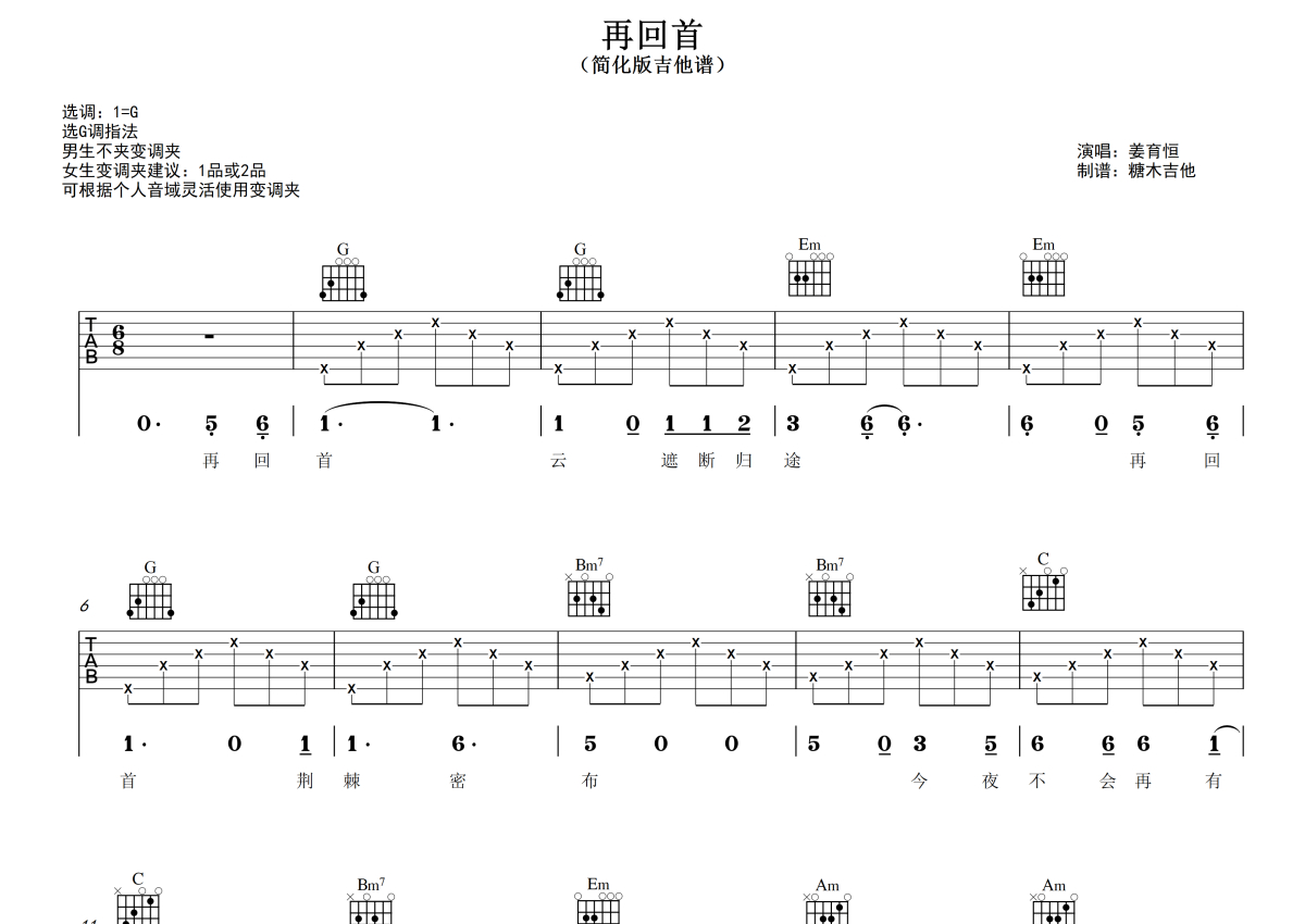 《再回首》是姜育恒演唱的一首歌曲,拍号为4/4拍,歌曲原调为G调,本吉他谱采用的是G调指法编配,演奏时不需要使用变调夹即为原调,这份吉他谱共有四张高清图谱,图谱由 @糖木吉他 编配上传,图谱使用六线谱编配,包含吉他和弦指法、简谱以及歌词部分,使用这份再回首吉他谱,可以让你更加方便地掌握这首歌曲的弹唱技巧,快来尝试吧。对新手超友好的简化版吉他弹唱谱《再回首》 姜育恒G调指法版 谱曲对应视频示范以及音频示范都可在抖音搜索(糖木吉他)观看 想要更多吉他谱,可在抖音和小红书搜索关注“糖木吉他” 或者添加老师微信“Tangmu2867 ”来获取更多简单弹唱的吉他谱和弹唱视频。