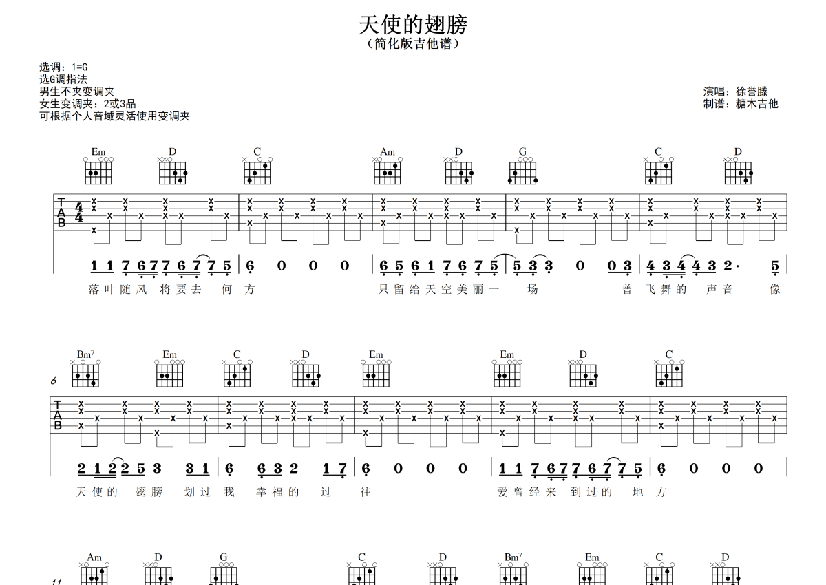 《天使的翅膀》是徐誉滕演唱的一首歌曲,拍号为4/4拍,歌曲原调为G调,本吉他谱采用的是G调指法编配,演奏时不需要使用变调夹即为原调,这份吉他谱共有两张高清图谱,图谱由 @糖木吉他 编配上传,图谱使用六线谱编配,包含吉他和弦指法、简谱以及歌词部分,使用这份天使的翅膀吉他谱,可以让你更加方便地掌握这首歌曲的弹唱技巧,快来尝试吧。对新手超友好的简化版吉他弹唱谱《天使的翅膀》 徐誉滕C调指法版 谱曲对应视频示范以及音频示范都可在抖音搜索(糖木吉他)观看 想要更多吉他谱,可在抖音和小红书搜索关注“糖木吉他” 或者添加老师微信“Tangmu2867 ”来获取更多简单弹唱的吉他谱和弹唱视频。