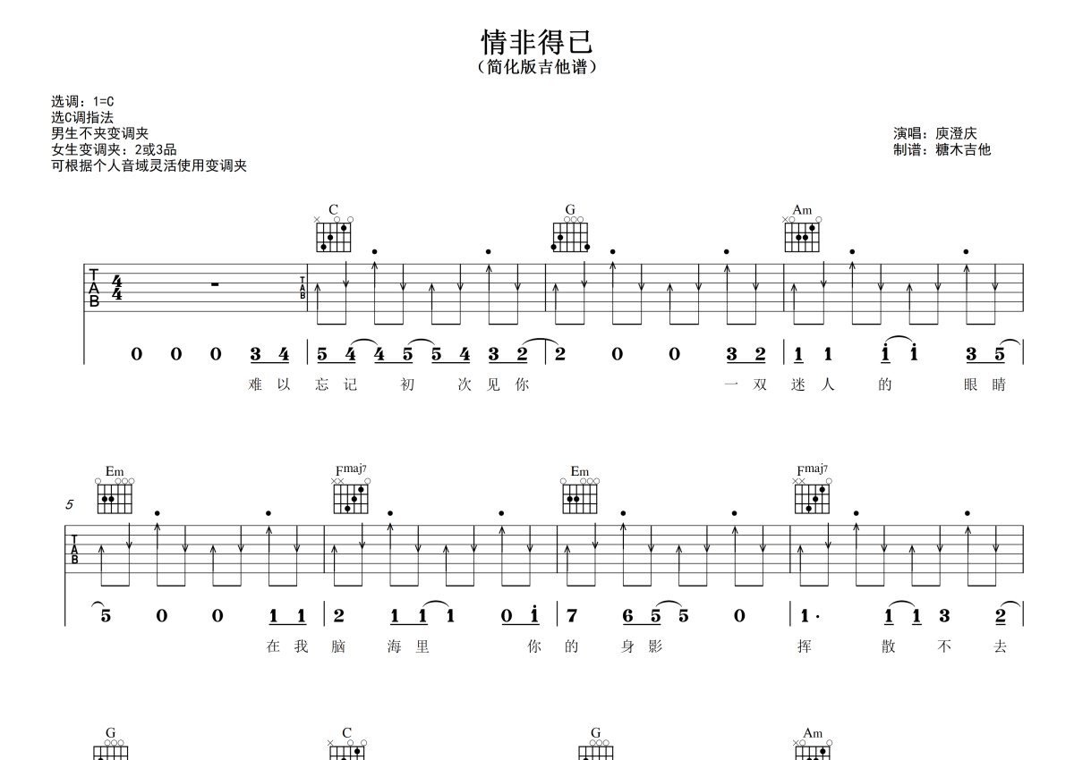 《情非得已》是庾澄庆演唱的一首歌曲,拍号为4/4拍,歌曲原调为C调,本吉他谱采用的是C调指法编配,演奏时不需要使用变调夹即为原调,这份吉他谱共有三张高清图谱,图谱由 @糖木吉他 编配上传,图谱使用六线谱编配,包含吉他和弦指法、简谱以及歌词部分,使用这份情非得已吉他谱,可以让你更加方便地掌握这首歌曲的弹唱技巧,快来尝试吧。对新手超友好的简化版吉他弹唱谱《情非得已》庾澄庆C调指法版 谱曲对应视频示范以及音频示范都可在抖音搜索(糖木吉他)观看 想要更多吉他谱,可在抖音和小红书搜索关注“糖木吉他” 或者添加老师微信“Tangmu2867 ”来获取更多简单弹唱的吉他谱和弹唱视频。