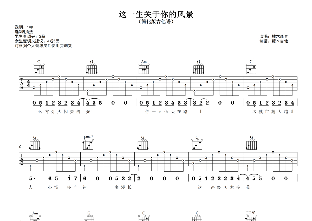 《这一生关于你的风景》是枯木逢春演唱的一首歌曲,拍号为4/4拍,歌曲原调为D调,但由于原调指法比较难,为了方便弹奏,本吉他谱采用的是C调指法编配,变调夹2品弹奏即为原调,当然也可以根据自己的音域改变变调夹位置,或者通过改变和弦调性,以方便自己弹奏,这份吉他谱共有三张高清图谱,图谱由 @糖木吉他 编配上传,图谱使用六线谱编配,包含吉他和弦指法、简谱以及歌词部分,使用这份这一生关于你的风景吉他谱,可以让你更加方便地掌握这首歌曲的弹唱技巧,快来尝试吧。对新手超友好的简化版吉他弹唱谱《这一生关于你的风景》枯木逢春C调指法版 谱曲对应视频示范以及音频示范都可在抖音搜索(糖木吉他)观看 想要更多吉他谱,可在抖音和小红书搜索关注“糖木吉他” 或者添加老师微信“Tangmu2867 ”来获取更多简单弹唱的吉他谱和弹唱视频。