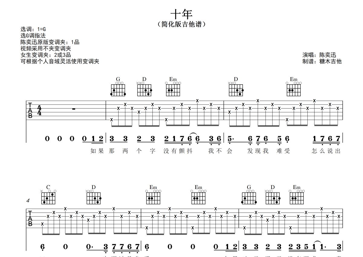 《十年》是陈奕迅演唱的一首歌曲,拍号为4/4拍,歌曲原调为G调,本吉他谱采用的是G调指法编配,演奏时不需要使用变调夹即为原调,这份吉他谱共有三张高清图谱,图谱由 @糖木吉他 编配上传,图谱使用六线谱编配,包含吉他和弦指法、简谱以及歌词部分,使用这份十年吉他谱,可以让你更加方便地掌握这首歌曲的弹唱技巧,快来尝试吧。对新手超友好的简化版吉他弹唱谱《十年》陈奕迅G调指法版 谱曲对应视频示范以及音频示范都可在抖音搜索(糖木吉他)观看 想要更多吉他谱,可在抖音和小红书搜索关注“糖木吉他” 或者添加老师微信“Tangmu2867 ”来获取更多简单弹唱的吉他谱和弹唱视频。