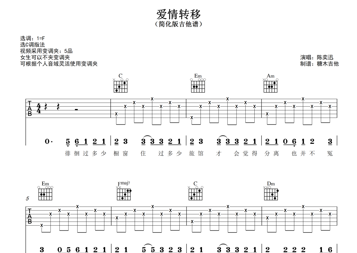 《爱情转移》是陈奕迅演唱的一首歌曲,拍号为4/4拍,歌曲原调为F调,但由于原调指法比较难,为了方便弹奏,本吉他谱采用的是C调指法编配,变调夹5品弹奏即为原调,当然也可以根据自己的音域改变变调夹位置,或者通过改变和弦调性,以方便自己弹奏,这份吉他谱共有四张高清图谱,图谱由 @糖木吉他 编配上传,图谱使用六线谱编配,包含吉他和弦指法、简谱以及歌词部分,使用这份爱情转移吉他谱,可以让你更加方便地掌握这首歌曲的弹唱技巧,快来尝试吧。对新手超友好的简化版吉他弹唱谱《爱情转移》陈奕迅C调指法版 谱曲对应视频示范以及音频示范都可在抖音搜索(糖木吉他)观看 想要更多吉他谱,可在抖音和小红书搜索关注“糖木吉他” 或者添加老师微信“Tangmu2867 ”来获取更多简单弹唱的吉他谱和弹唱视频。