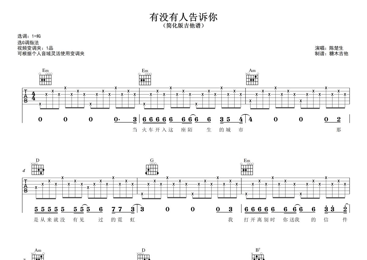 《有没有人告诉你》是陈楚生演唱的一首歌曲,拍号为4/4拍,歌曲原调为Ab调,但由于原调指法比较难,为了方便弹奏,本吉他谱采用的是G调指法编配,变调夹1品弹奏即为原调,当然也可以根据自己的音域改变变调夹位置,或者通过改变和弦调性,以方便自己弹奏,这份吉他谱共有三张高清图谱,图谱由 @糖木吉他 编配上传,图谱使用六线谱编配,包含吉他和弦指法、简谱以及歌词部分,使用这份有没有人告诉你吉他谱,可以让你更加方便地掌握这首歌曲的弹唱技巧,快来尝试吧。对新手超友好的简化版吉他弹唱谱《有没有人告诉你》陈楚生G调指法版 谱曲对应视频示范以及音频示范都可在抖音搜索(糖木吉他)观看 想要更多吉他谱,可在抖音和小红书搜索关注“糖木吉他” 或者添加老师微信“Tangmu2867 ”来获取更多简单弹唱的吉他谱和弹唱视频。