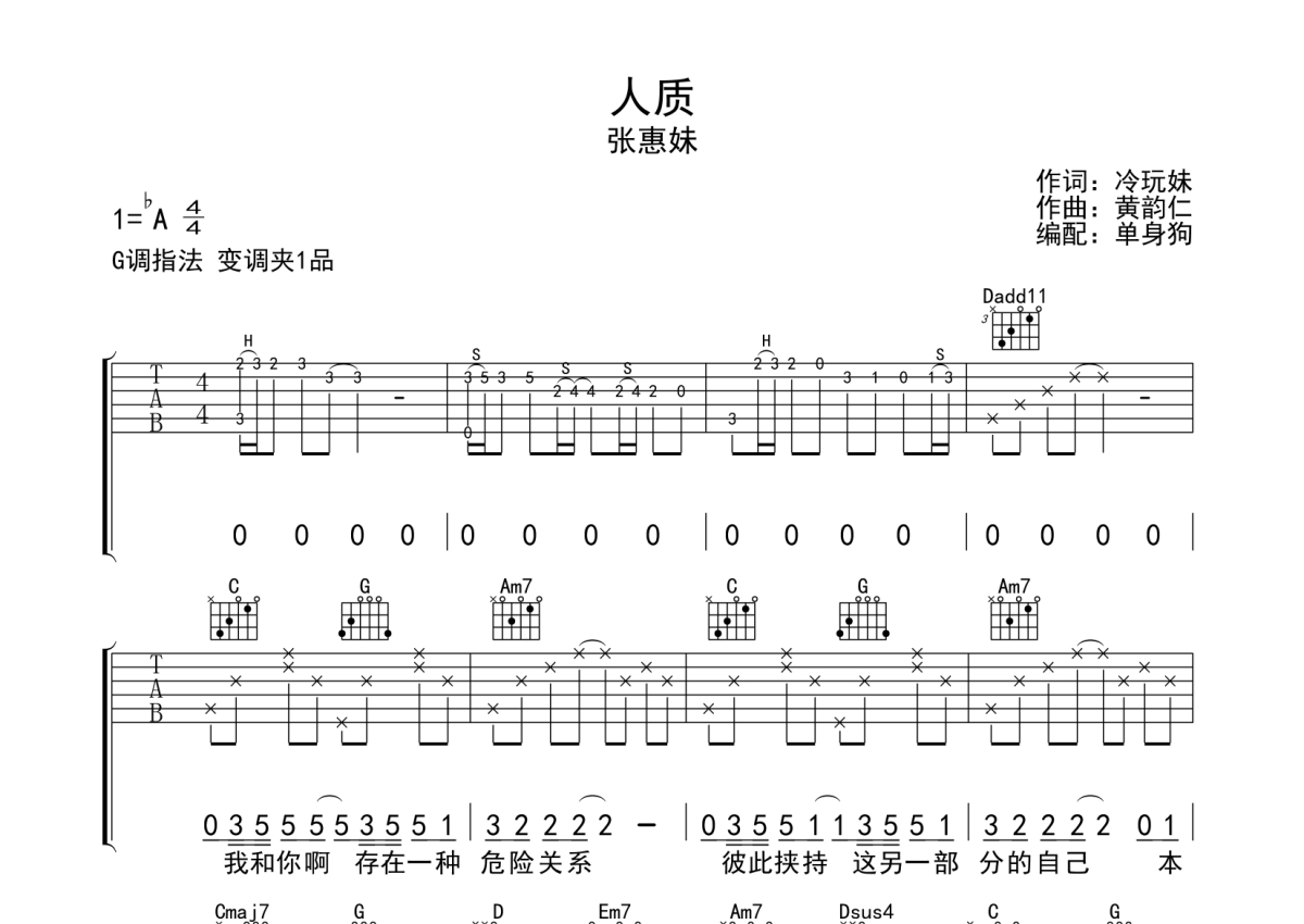 张惠妹《人质》吉他谱 - G调弹唱六线谱