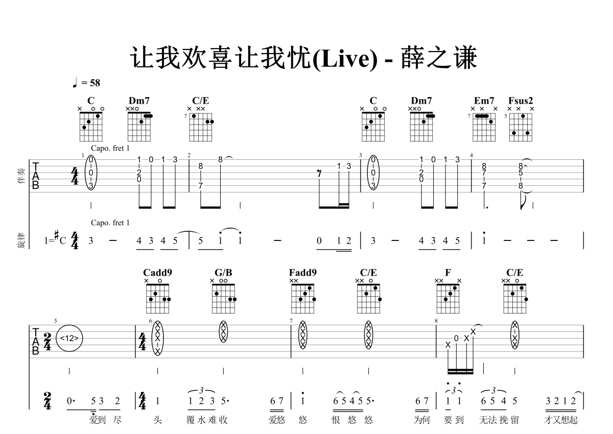 《让我欢喜让我忧》是薛之谦演唱的一首歌曲,石头音乐原版记谱,拍号为4/4拍,歌曲速度为每分钟58拍,歌曲原调为Db调,但由于原调指法比较难,为了方便弹奏,本吉他谱采用的是C调指法编配,变调夹1品弹奏即为原调,当然也可以根据自己的音域改变变调夹位置,或者通过改变和弦调性,以方便自己弹奏,这份吉他谱共有四张高清图谱,图谱由 @石头音乐 编配上传,图谱使用六线谱编配,包含吉他和弦指法、简谱以及歌词部分,曲谱配备了相关的音频提供试听,使用这份让我欢喜让我忧吉他谱,可以让你更加方便地掌握这首歌曲的弹唱技巧,快来尝试吧。