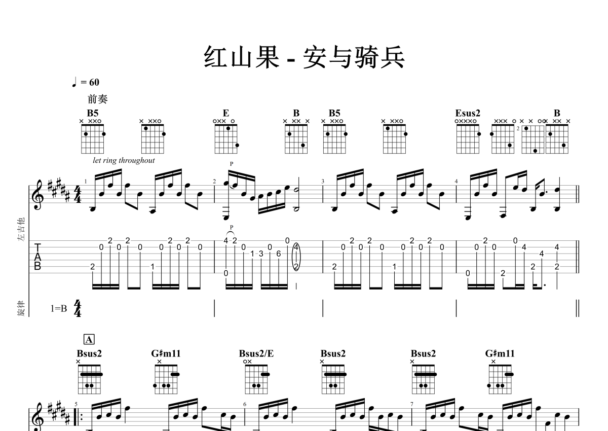 《红山果》是安与骑兵演唱的一首歌曲,石头音乐原版记谱,拍号为4/4拍,歌曲速度为每分钟60拍,歌曲原调为B调,但由于原调指法比较难,为了方便弹奏,本吉他谱采用的是B调指法编配,演奏时不需要使用变调夹即为原调,这份吉他谱共有四张高清图谱,图谱由 @石头音乐 编配上传,图谱使用六线谱编配,包含吉他和弦指法、简谱以及歌词部分,曲谱配备了相关的音频提供试听,使用这份红山果吉他谱,可以让你更加方便地掌握这首歌曲的弹唱技巧,快来尝试吧。