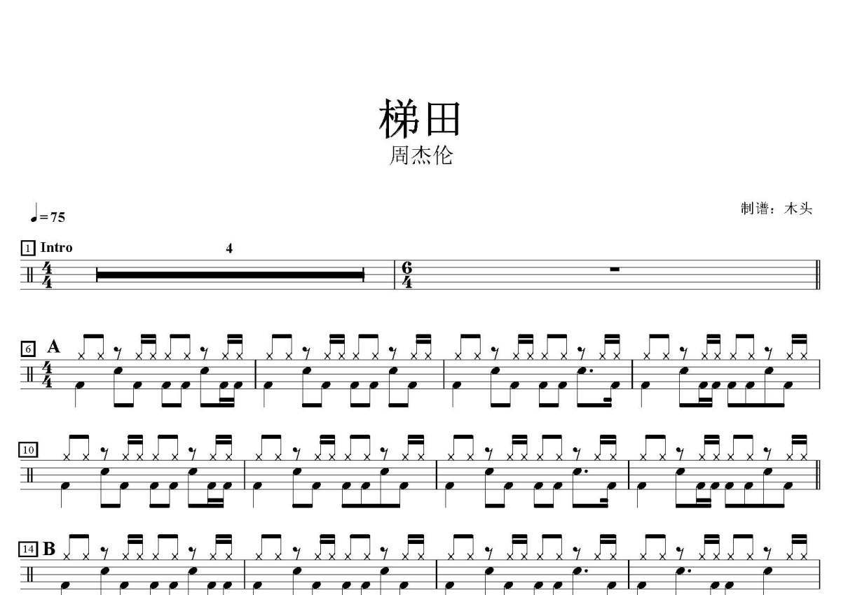 《梯田》是周杰伦演唱的一首歌曲,这份鼓谱共有两张高清图谱,图谱由 @打鼓谱 编配上传,图谱使用五线谱编配,使用这份梯田架子鼓谱,你将能够轻松地敲打出这首周杰伦的梯田,快来尝试吧。歌曲名:梯田,歌手名:周杰伦,专辑名:叶惠美。