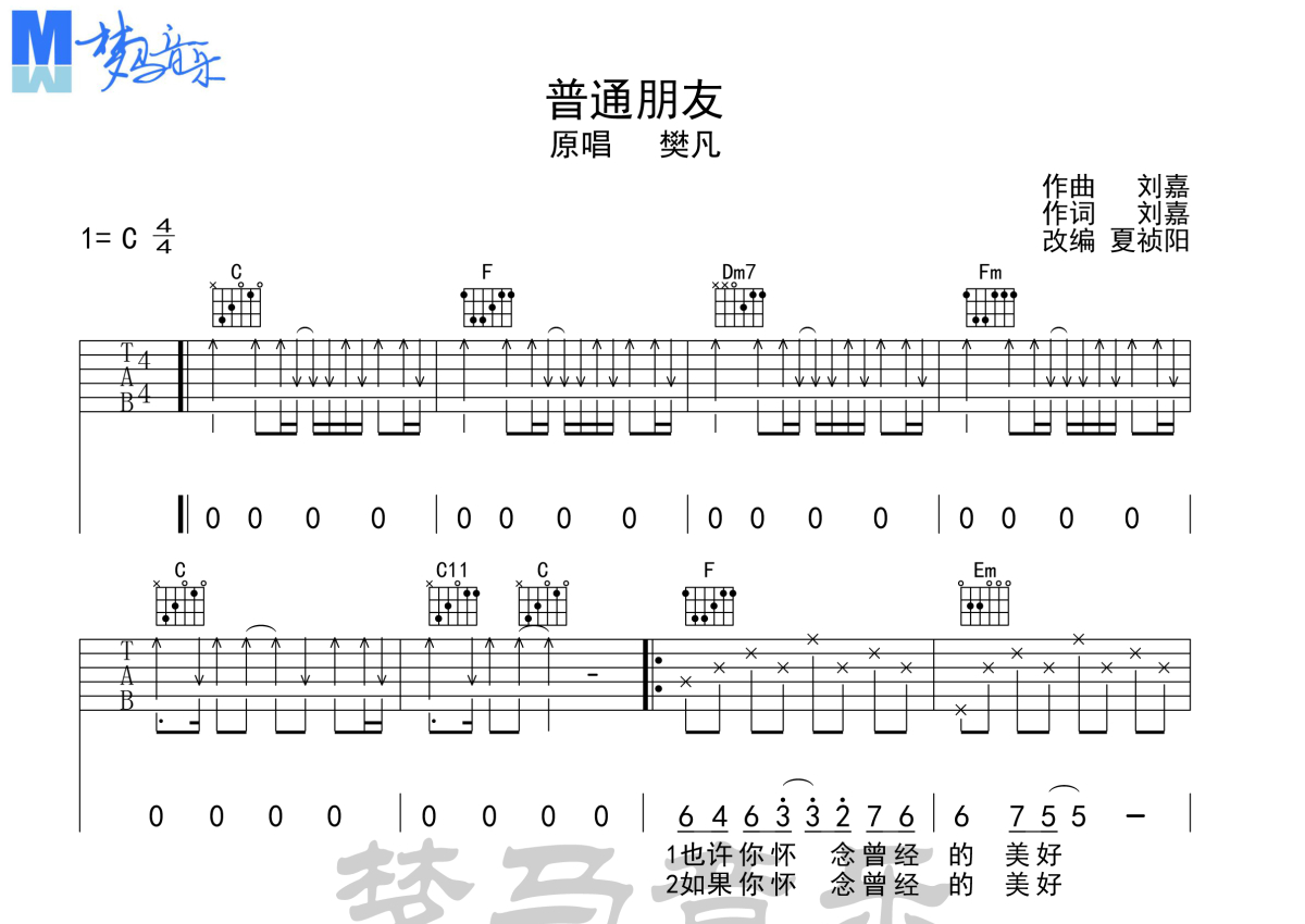 樊凡《普通朋友》吉他谱 - C调弹唱六线谱