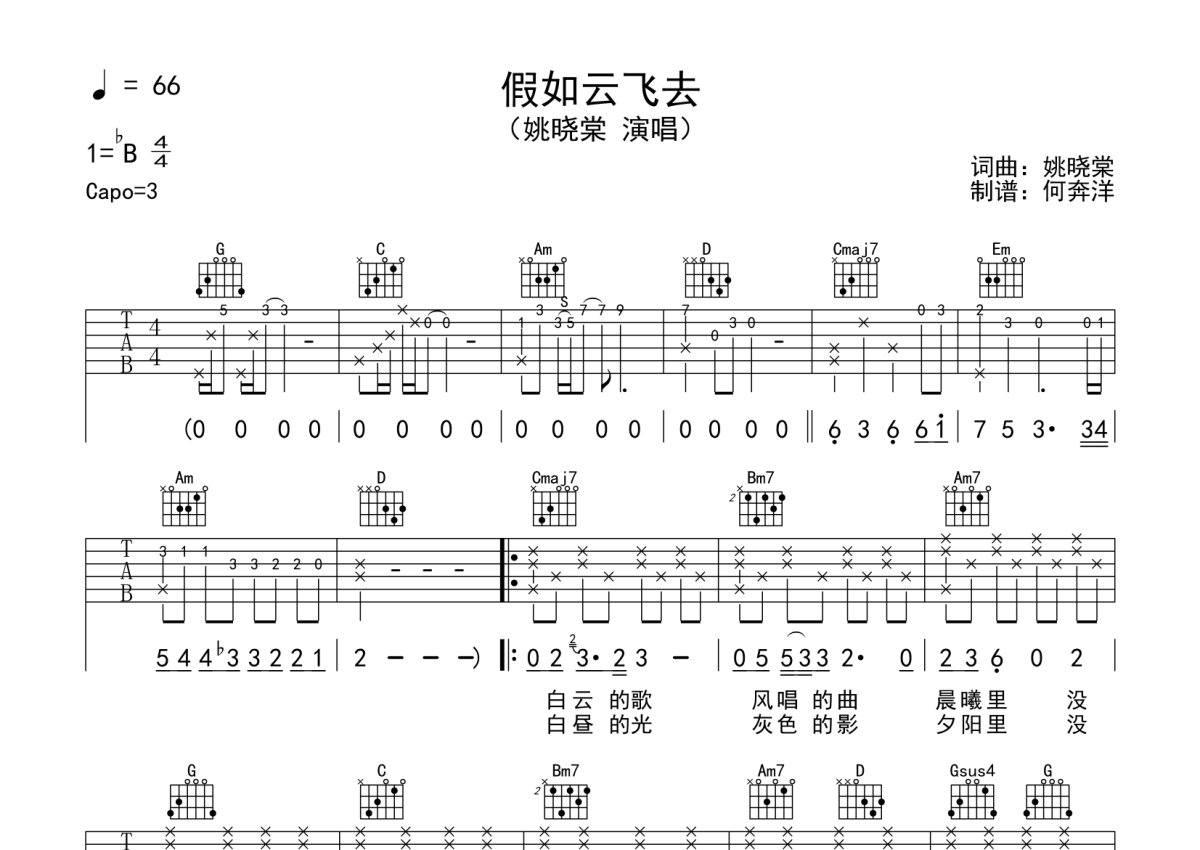 姚晓棠《假如云飞去》吉他谱 - G调弹唱六线谱