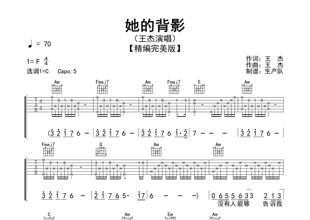 《她的背影》是王杰演唱的一首歌曲,精编民谣版,拍号为4/4拍,歌曲速度为每分钟70拍,歌曲原调为F调,但由于原调指法比较难,为了方便弹奏,本吉他谱采用的是C调指法编配,变调夹5品弹奏即为原调,当然也可以根据自己的音域改变变调夹位置,或者通过改变和弦调性,以方便自己弹奏,这份吉他谱共有三张高清图谱,图谱由 @生产队 编配上传,图谱使用六线谱编配,包含吉他和弦指法、简谱以及歌词部分,使用这份她的背影吉他谱,可以让你更加方便地掌握这首歌曲的弹唱技巧,快来尝试吧。《她的背影》是王杰作词、作曲,陈志远编曲,王杰演唱的一首歌曲,收录在王杰1989年1月18日由飞碟唱片发行的专辑《是否我真的一无所有》中。本吉他谱根据原版采用C调指法被迫,精准的前奏、间奏、尾奏及SOLO编配,主歌采用四配三民谣分解节奏,副歌扫弦节奏,效果很棒,值得推荐的经典作品!。