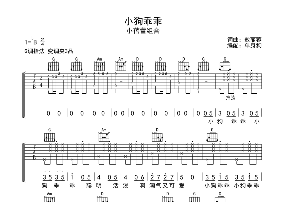 《小狗乖乖》是小蓓蕾组合演唱的一首歌曲,拍号为2/4拍,歌曲原调为Bb调,但由于原调指法比较难,为了方便弹奏,本吉他谱采用的是G调指法编配,变调夹3品弹奏即为原调,当然也可以根据自己的音域改变变调夹位置,或者通过改变和弦调性,以方便自己弹奏,这份吉他谱共有一张高清图谱,图谱由 @单身狗 编配上传,图谱使用六线谱编配,包含吉他和弦指法、简谱以及歌词部分,使用这份小狗乖乖吉他谱,可以让你更加方便地掌握这首歌曲的弹唱技巧,快来尝试吧。