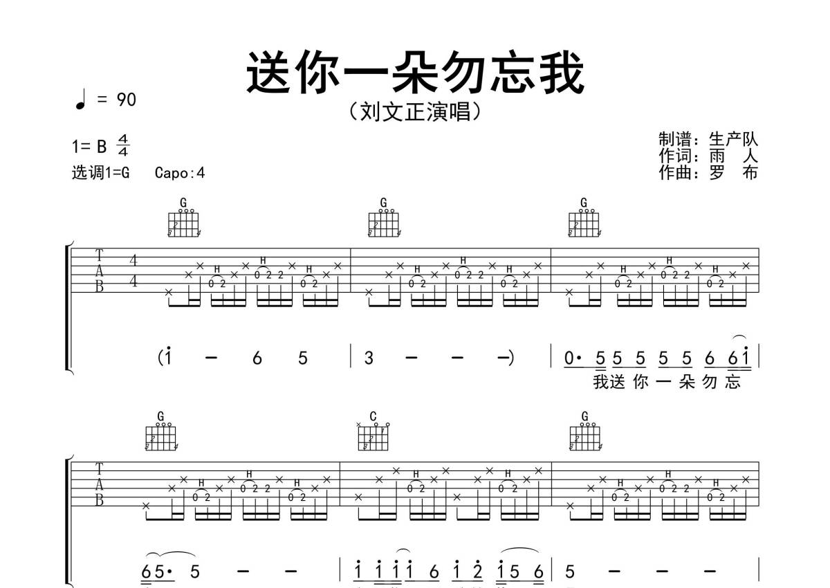 《送你一朵勿忘我》是刘文正演唱的一首歌曲,精编乡村版,拍号为4/4拍,歌曲速度为每分钟90拍,歌曲原调为B调,但由于原调指法比较难,为了方便弹奏,本吉他谱采用的是G调指法编配,变调夹4品弹奏即为原调,当然也可以根据自己的音域改变变调夹位置,或者通过改变和弦调性,以方便自己弹奏,这份吉他谱共有三张高清图谱,图谱由 @生产队 编配上传,图谱使用六线谱编配,包含吉他和弦指法、简谱以及歌词部分,使用这份送你一朵勿忘我吉他谱,可以让你更加方便地掌握这首歌曲的弹唱技巧,快来尝试吧。《送你一朵勿忘我》是刘文正演唱的歌曲,收录于《闪亮岁月刘文正全集2》专辑中。本吉他谱根据原版采用G调指法编配,精准的前奏、间奏、尾奏及SOLO编配,值得推荐学习的一首乡村风格歌曲!。