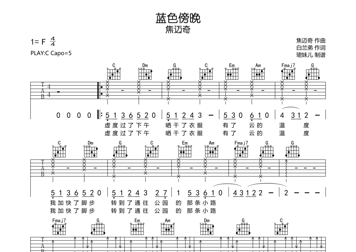 焦迈奇《蓝色傍晚》吉他谱 - C调弹唱六线谱