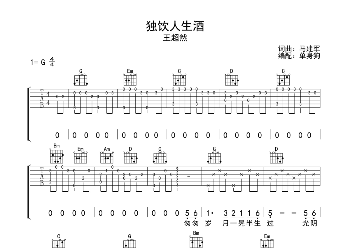 王超然《独饮人生酒》吉他谱 - G调弹唱六线谱