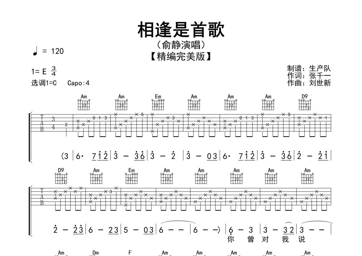 《相逢是首歌》是俞静演唱的一首歌曲,精编完美版,拍号为3/4拍,歌曲速度为每分钟120拍,歌曲原调为E调,但由于原调指法比较难,为了方便弹奏,本吉他谱采用的是C调指法编配,变调夹4品弹奏即为原调,当然也可以根据自己的音域改变变调夹位置,或者通过改变和弦调性,以方便自己弹奏,这份吉他谱共有三张高清图谱,图谱由 @生产队 编配上传,图谱使用六线谱编配,包含吉他和弦指法、简谱以及歌词部分,使用这份相逢是首歌吉他谱,可以让你更加方便地掌握这首歌曲的弹唱技巧,快来尝试吧。《相逢是首歌》是1996年电视剧《红十字方队》的主题曲,歌曲原唱是俞静。本吉他谱根据原版采用C调指法编配,精准的前奏、间奏、尾奏及SOLO编配,值得推荐学习的经典作品!。