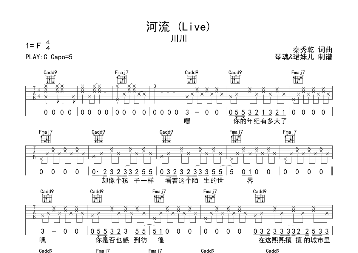 《河流》是川川演唱的一首歌曲,拍号为4/4拍,歌曲速度为每分钟84拍,歌曲原调为F调,但由于原调指法比较难,为了方便弹奏,本吉他谱采用的是C调指法编配,变调夹5品弹奏即为原调,当然也可以根据自己的音域改变变调夹位置,或者通过改变和弦调性,以方便自己弹奏,这份吉他谱共有两张高清图谱,图谱由 @珺妹儿 编配上传,图谱使用六线谱编配,包含吉他和弦指法、简谱以及歌词部分,使用这份河流吉他谱,可以让你更加方便地掌握这首歌曲的弹唱技巧,快来尝试吧。