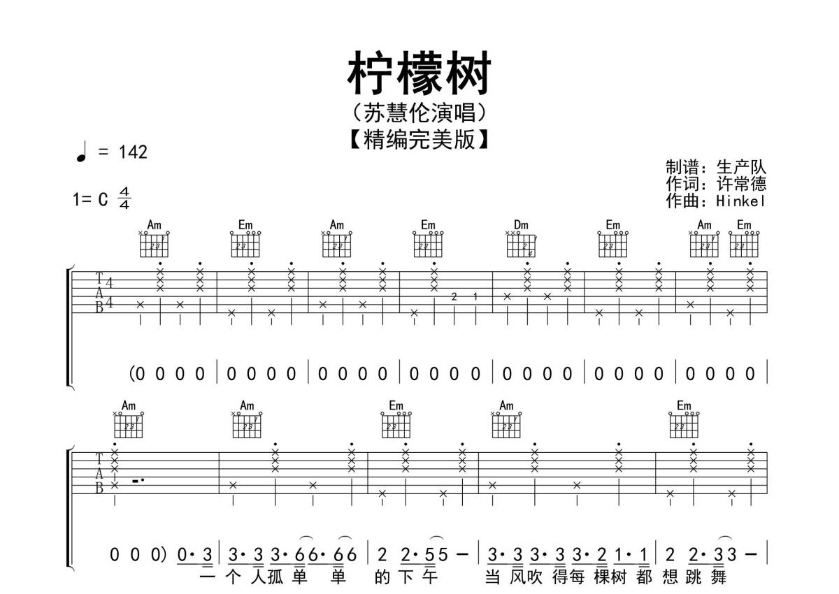 《柠檬树》是苏慧伦演唱的一首歌曲,精编完美版,拍号为4/4拍,歌曲速度为每分钟142拍,歌曲原调为C调,本吉他谱采用的是C调指法编配,演奏时不需要使用变调夹即为原调,这份吉他谱共有四张高清图谱,图谱由 @生产队 编配上传,图谱使用六线谱编配,包含吉他和弦指法、简谱以及歌词部分,使用这份柠檬树吉他谱,可以让你更加方便地掌握这首歌曲的弹唱技巧,快来尝试吧。《柠檬树》是台湾女歌手苏慧伦演唱的一首流行歌曲,收录于苏慧伦1996年的同名专辑《Lemon Tree》中 。本吉他谱根据原版C调指法编配,采用切音节奏,注意扫弦节奏要有摇摆的味道!动感十足的歌曲,一音不差版,值得推荐学习的经典作品!。
