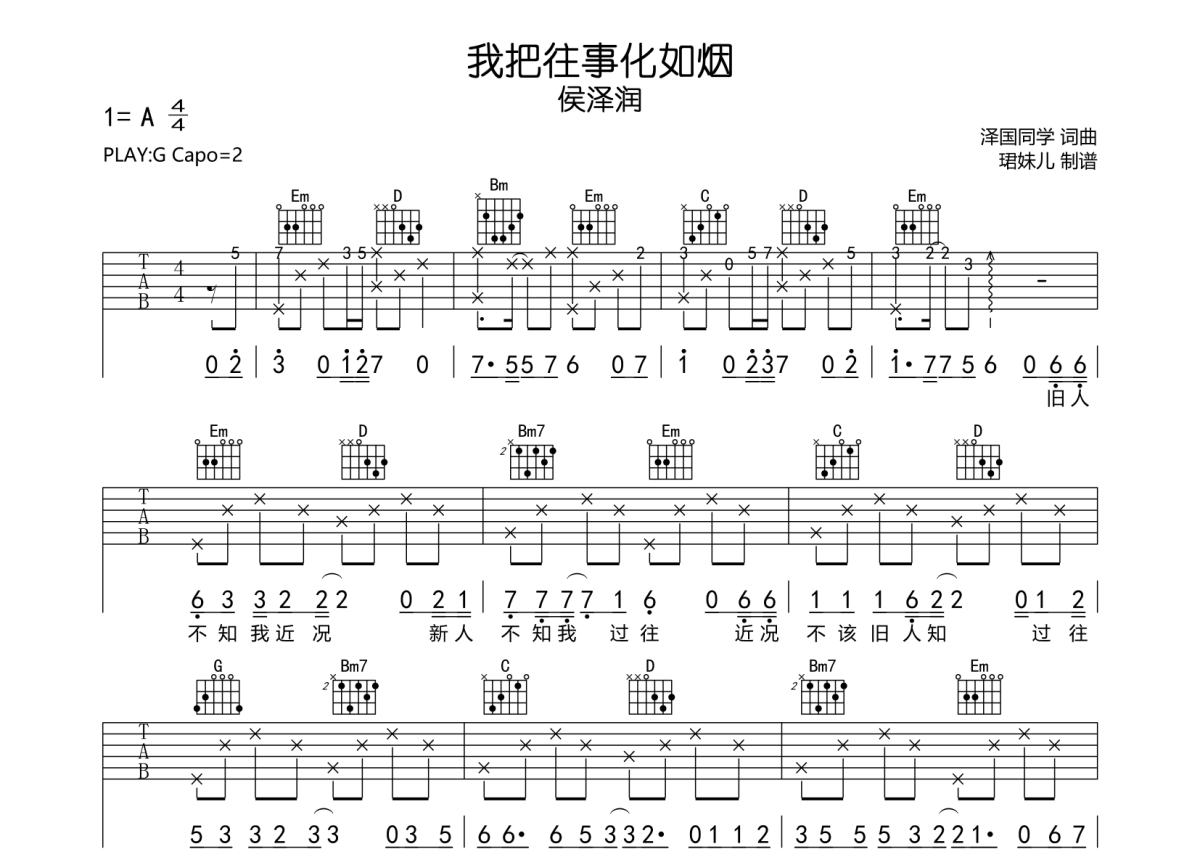 侯泽润《我把往事化如烟》吉他谱 - G调弹唱六线谱