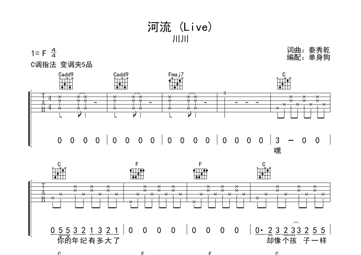 川川《河流》吉他谱 - C调弹唱六线谱 - live