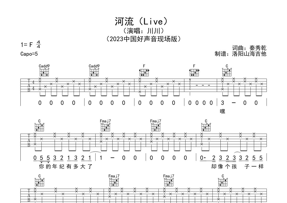 川川《河流》吉他谱 - C调弹唱六线谱 - 2023中国好声音现场版