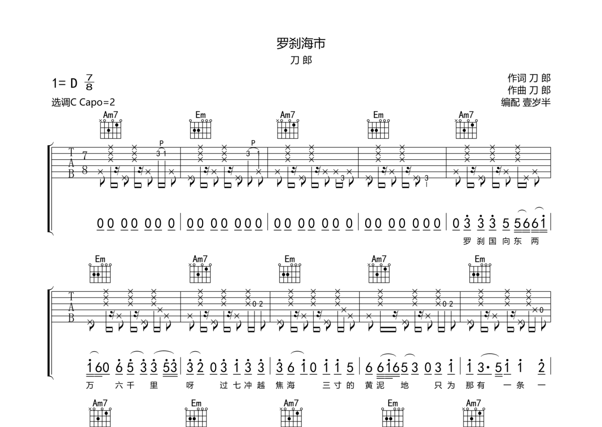 《罗刹海市》是刀郎演唱的一首歌曲,歌曲速度为每分钟75拍,歌曲原调为D调,但由于原调指法比较难,为了方便弹奏,本吉他谱采用的是C调指法编配,变调夹2品弹奏即为原调,当然也可以根据自己的音域改变变调夹位置,或者通过改变和弦调性,以方便自己弹奏,这份吉他谱共有五张高清图谱,图谱由 @壹岁半 编配上传,图谱使用六线谱编配,包含吉他和弦指法、简谱以及歌词部分,曲谱配备了相关的音频提供试听,使用这份罗刹海市吉他谱,可以让你更加方便地掌握这首歌曲的弹唱技巧,快来尝试吧。音频示范从开始至第一段间奏结束。建议多跟着原曲弹。