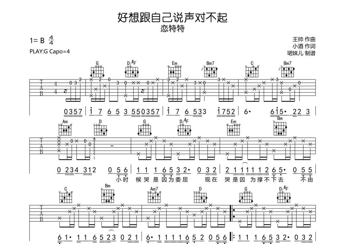 《好想跟自己说声对不起》是恋特特演唱的一首歌曲,拍号为4/4拍,歌曲速度为每分钟84拍,歌曲原调为B调,但由于原调指法比较难,为了方便弹奏,本吉他谱采用的是G调指法编配,变调夹4品弹奏即为原调,当然也可以根据自己的音域改变变调夹位置,或者通过改变和弦调性,以方便自己弹奏,这份吉他谱共有两张高清图谱,图谱由 @珺妹儿 编配上传,图谱使用六线谱编配,包含吉他和弦指法、简谱以及歌词部分,使用这份好想跟自己说声对不起吉他谱,可以让你更加方便地掌握这首歌曲的弹唱技巧,快来尝试吧。