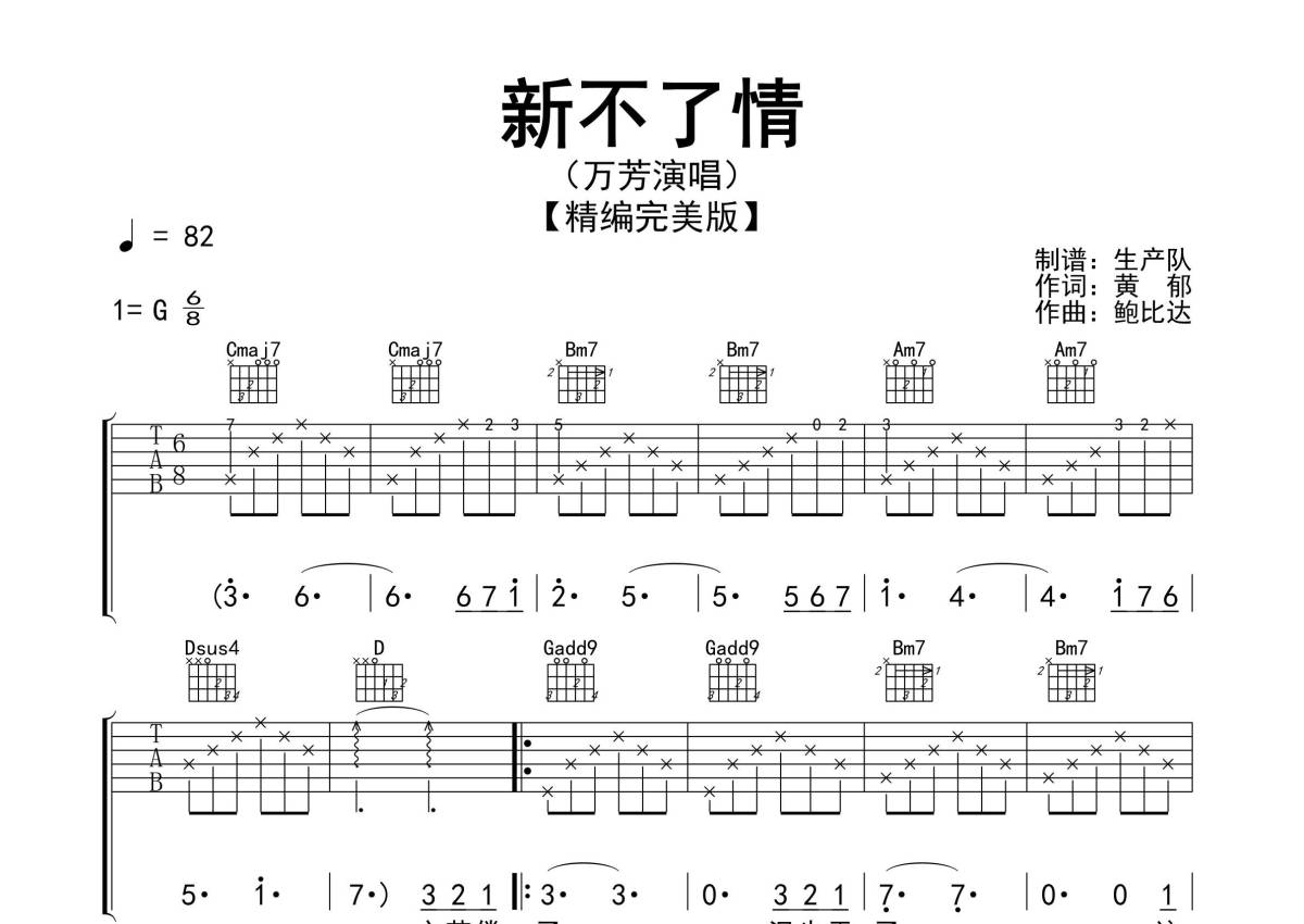 《新不了情》是万芳演唱的一首歌曲,精编完美版,拍号为4/4拍,歌曲速度为每分钟82拍,歌曲原调为G调,本吉他谱采用的是G调指法编配,演奏时不需要使用变调夹即为原调,这份吉他谱共有三张高清图谱,图谱由 @生产队 编配上传,图谱使用六线谱编配,包含吉他和弦指法、简谱以及歌词部分,使用这份新不了情吉他谱,可以让你更加方便地掌握这首歌曲的弹唱技巧,快来尝试吧。《新不了情》是万芳演唱的歌曲,亦是同名电影的主题曲,由黄郁作词、鲍比达作曲,收录于音乐专辑《新不了情电影原声带》。本吉他谱根据原版G调指法编配,完整的前奏、间奏、尾奏,主歌分解节奏,副歌扫弦节奏编配,是一首值得推荐学习的经典作品!。