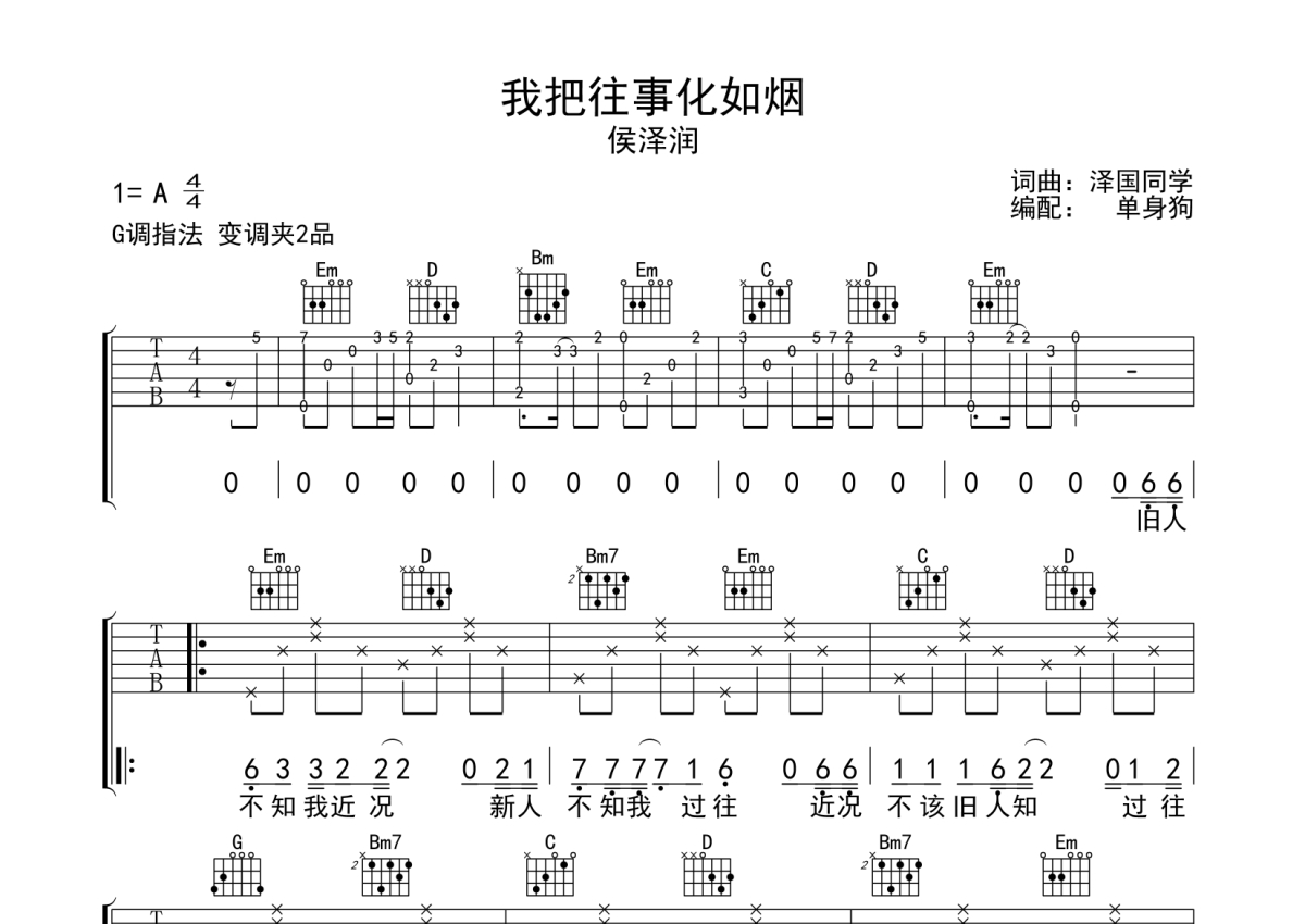 侯泽润《我把往事化如烟》吉他谱 - G调弹唱六线谱