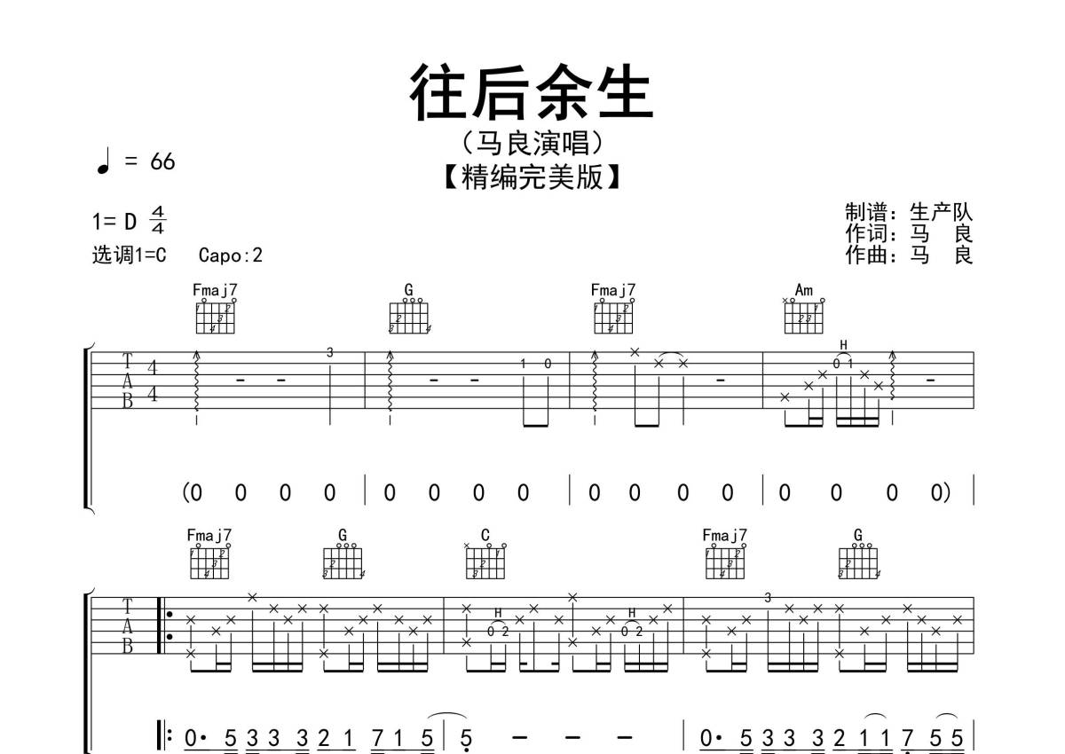 《往后余生》是马良演唱的一首歌曲,精编民谣版,拍号为4/4拍,歌曲速度为每分钟66拍,歌曲原调为D调,但由于原调指法比较难,为了方便弹奏,本吉他谱采用的是C调指法编配,变调夹2品弹奏即为原调,当然也可以根据自己的音域改变变调夹位置,或者通过改变和弦调性,以方便自己弹奏,这份吉他谱共有三张高清图谱,图谱由 @生产队 编配上传,图谱使用六线谱编配,包含吉他和弦指法、简谱以及歌词部分,使用这份往后余生吉他谱,可以让你更加方便地掌握这首歌曲的弹唱技巧,快来尝试吧。《往后余生》是马良演唱的歌曲,由马良填词、谱曲,郭扬、周成编曲,2019年1月20日,该曲获第26届东方风云榜音乐盛典十大金曲奖 。本吉他谱根据原版采用C调指法编配,完整的前奏、间奏、尾奏编配,是一首值得推荐学习的民谣作品!。