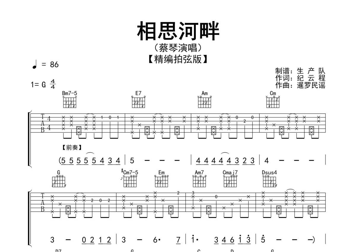 《相思河畔》是蔡琴演唱的一首歌曲,精编拍弦版,拍号为4/4拍,歌曲速度为每分钟86拍,歌曲原调为G调,本吉他谱采用的是G调指法编配,演奏时不需要使用变调夹即为原调,这份吉他谱共有三张高清图谱,图谱由 @生产队 编配上传,图谱使用六线谱编配,包含吉他和弦指法、简谱以及歌词部分,使用这份相思河畔吉他谱,可以让你更加方便地掌握这首歌曲的弹唱技巧,快来尝试吧。《相思河畔》是一首由蔡琴演唱的经典民谣歌曲,收录在专辑《人生就是戏》中。本吉他谱根据原版G调指法编配,精准的前奏、间奏、尾奏,采用拍弦节奏编配,一音不差版,效果很棒!本曲的和弦非常的出彩,值得推荐品味的经典歌曲!。