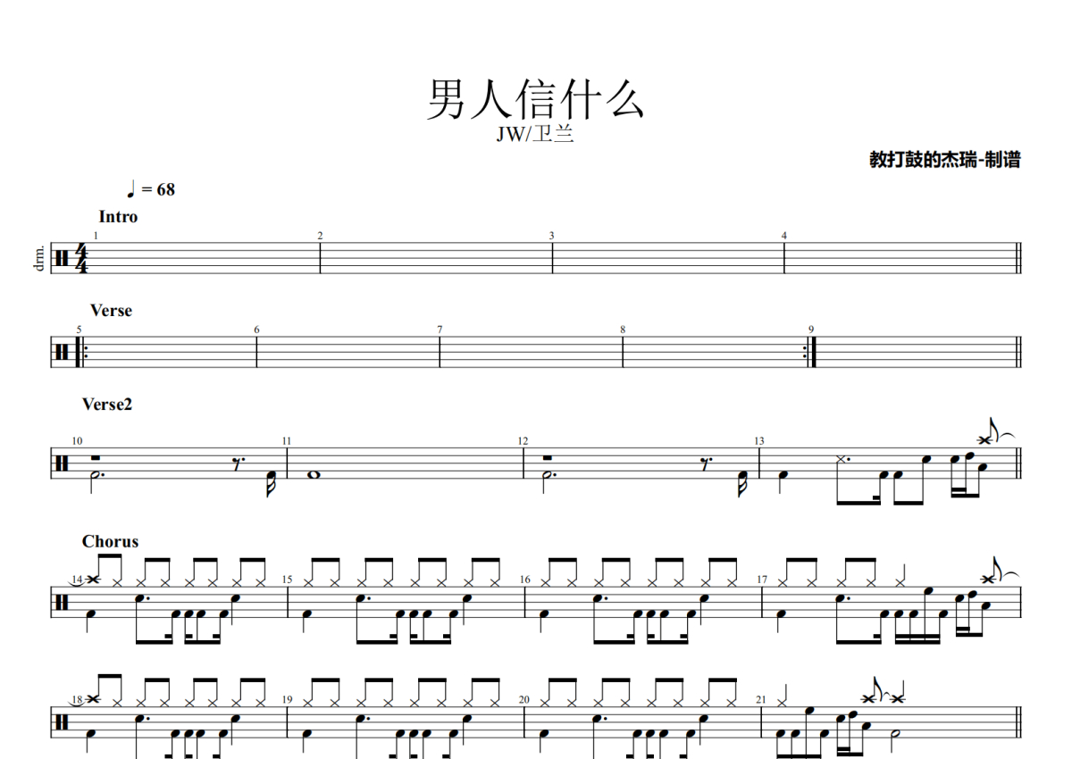 JW/卫兰《男人信什么》鼓谱 - 架子鼓谱