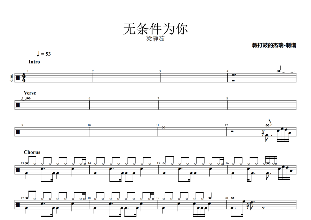 《无条件为你》是梁静茹演唱的一首歌曲,拍号为4/4拍,歌曲速度为每分钟53拍,这份鼓谱共有两张高清图谱,图谱由 @Jerry 编配上传,图谱使用五线谱编配,使用这份无条件为你架子鼓谱,你将能够轻松地敲打出这首梁静茹的无条件为你,快来尝试吧。