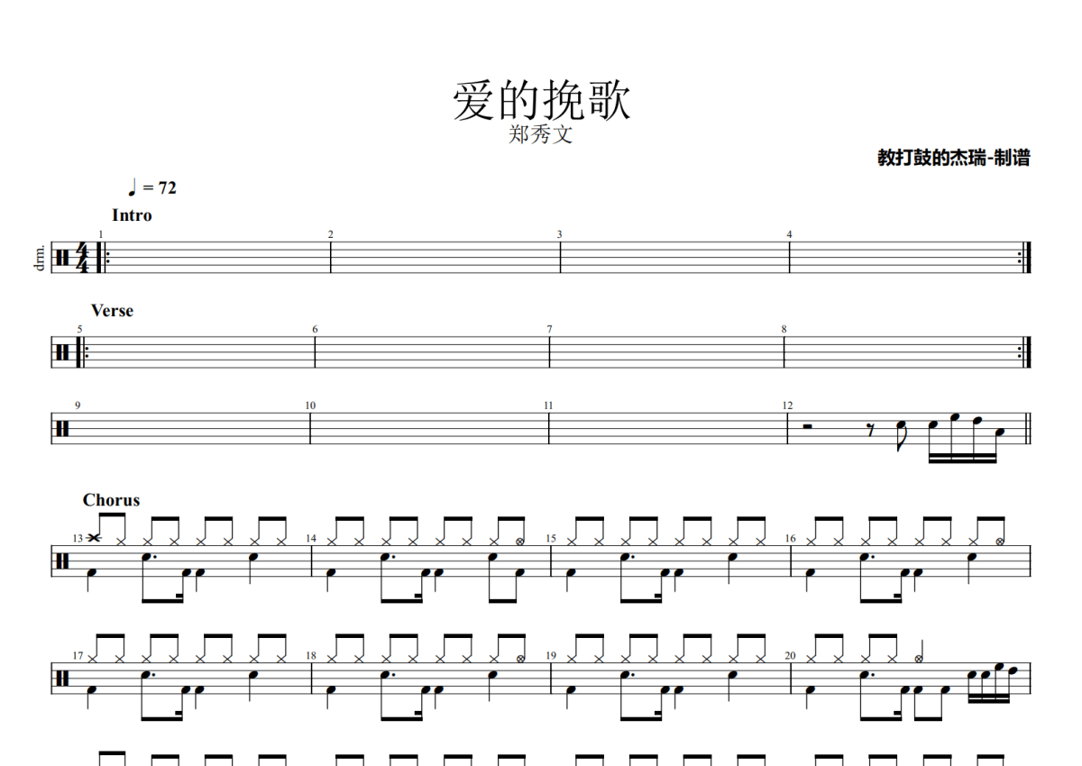 《爱的挽歌》是郑秀文演唱的一首歌曲,拍号为4/4拍,歌曲速度为每分钟72拍,这份鼓谱共有三张高清图谱,图谱由 @Jerry 编配上传,图谱使用五线谱编配,使用这份爱的挽歌架子鼓谱,你将能够轻松地敲打出这首郑秀文的爱的挽歌,快来尝试吧。