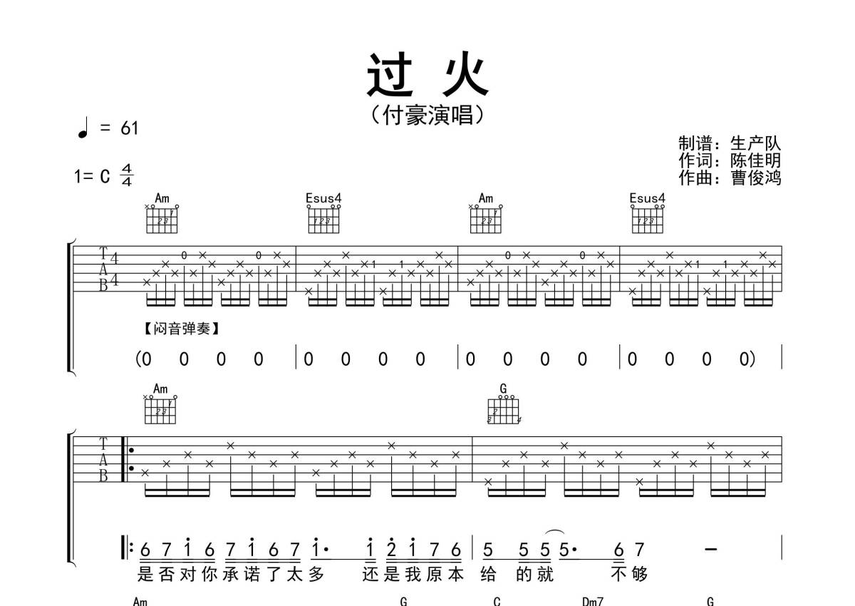 《过火》是付豪演唱的一首歌曲,精编摇滚版,拍号为4/4拍,歌曲速度为每分钟61拍,歌曲原调为C调,本吉他谱采用的是C调指法编配,演奏时不需要使用变调夹即为原调,这份吉他谱共有三张高清图谱,图谱由 @生产队 编配上传,图谱使用六线谱编配,包含吉他和弦指法、简谱以及歌词部分,使用这份过火吉他谱,可以让你更加方便地掌握这首歌曲的弹唱技巧,快来尝试吧。本吉他谱《过火》是根据付豪翻唱的摇滚版本原版编配,采用摇滚闷音技术编配,主歌分解节奏,副歌扫弦节奏,效果很好,值得推荐学习的经典作品!。