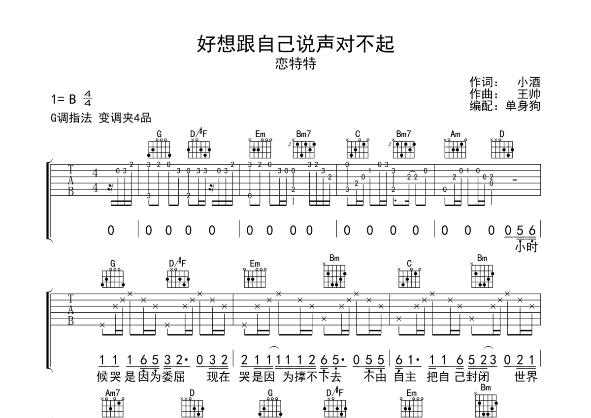 恋特特《好想跟自己说声对不起》吉他谱 - G调弹唱六线谱