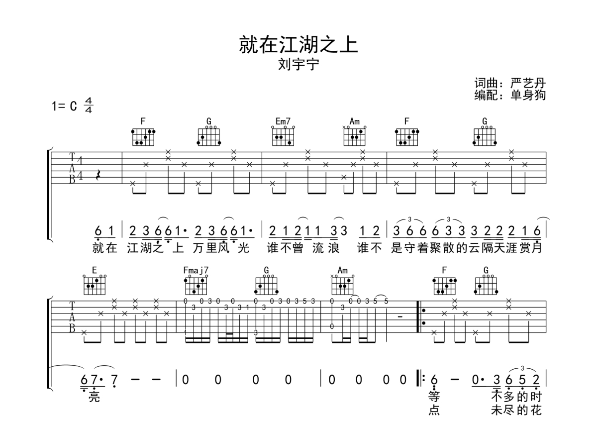 刘宇宁《就在江湖之上》吉他谱 - C调弹唱六线谱