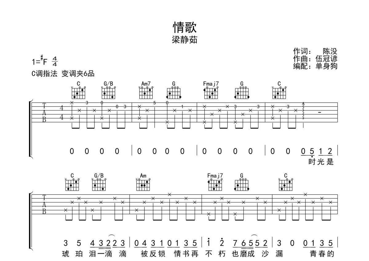 梁静茹《情歌》吉他谱 - C调弹唱六线谱