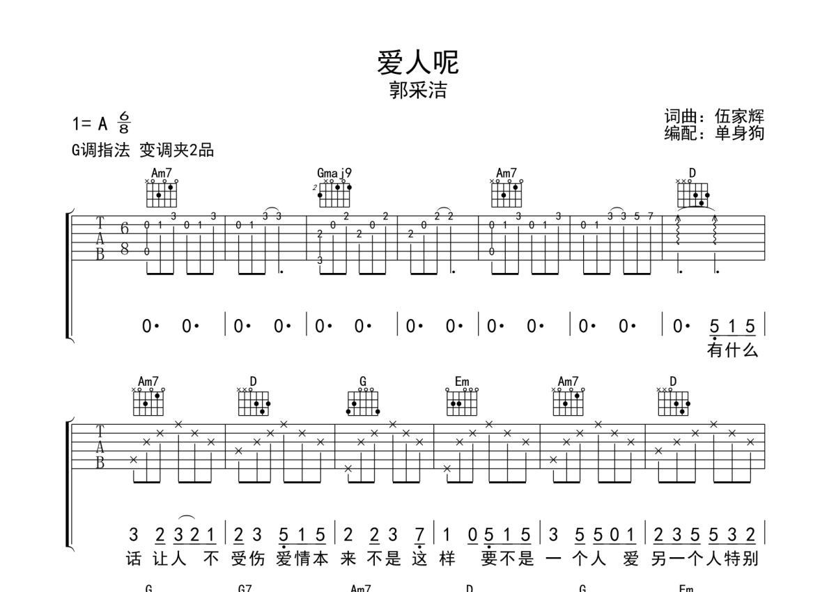 郭采洁《爱人呢》吉他谱 - G调弹唱六线谱