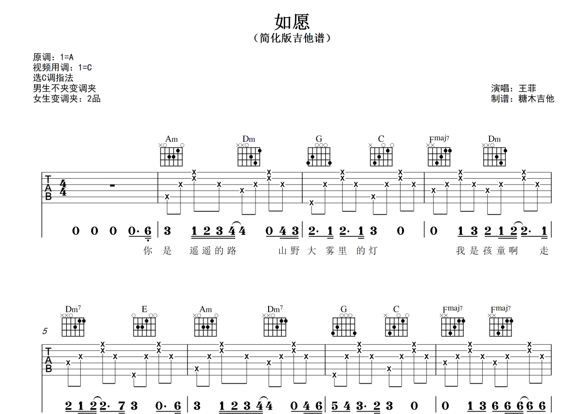 王菲《如愿》吉他谱 - 弹唱六线谱