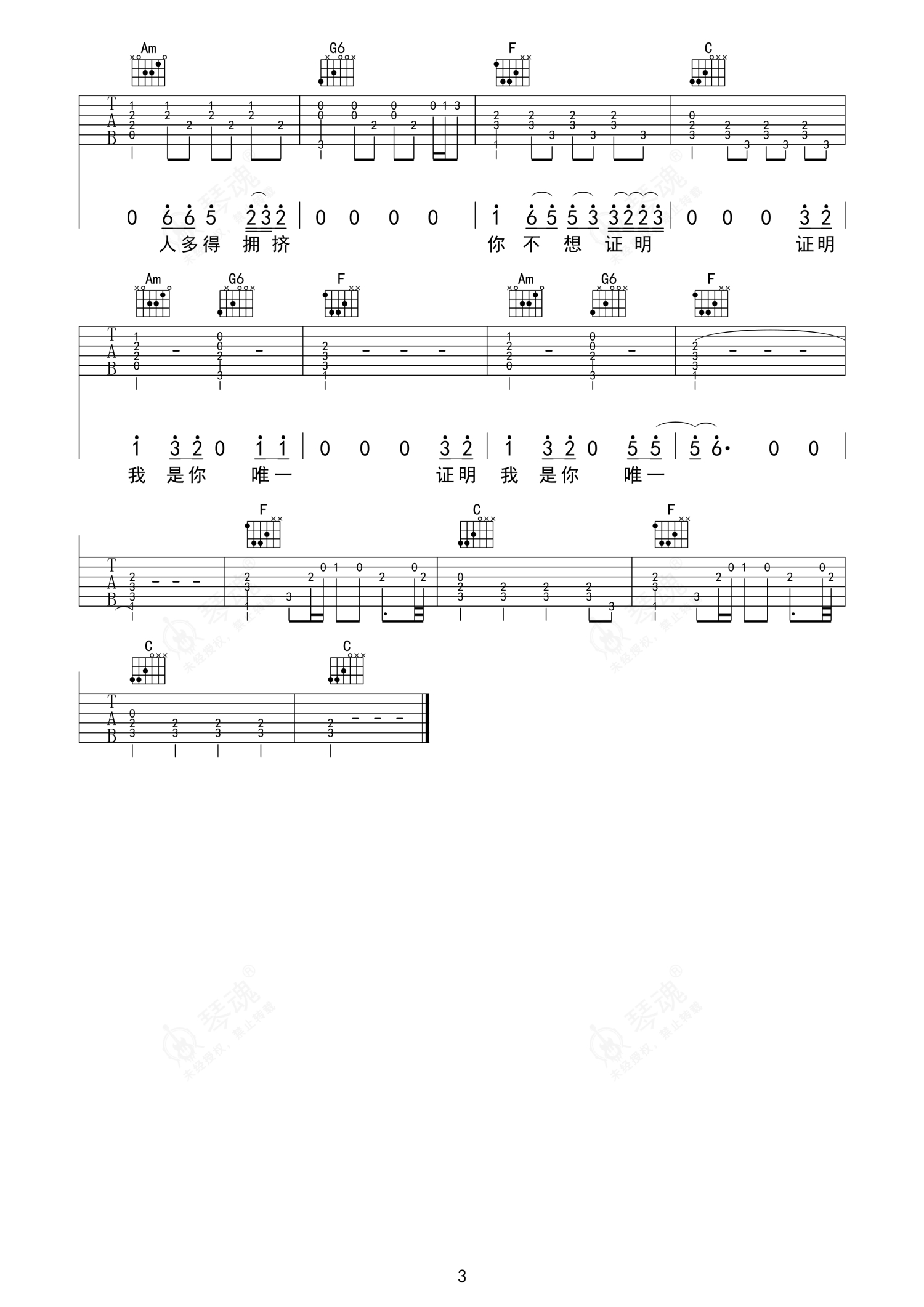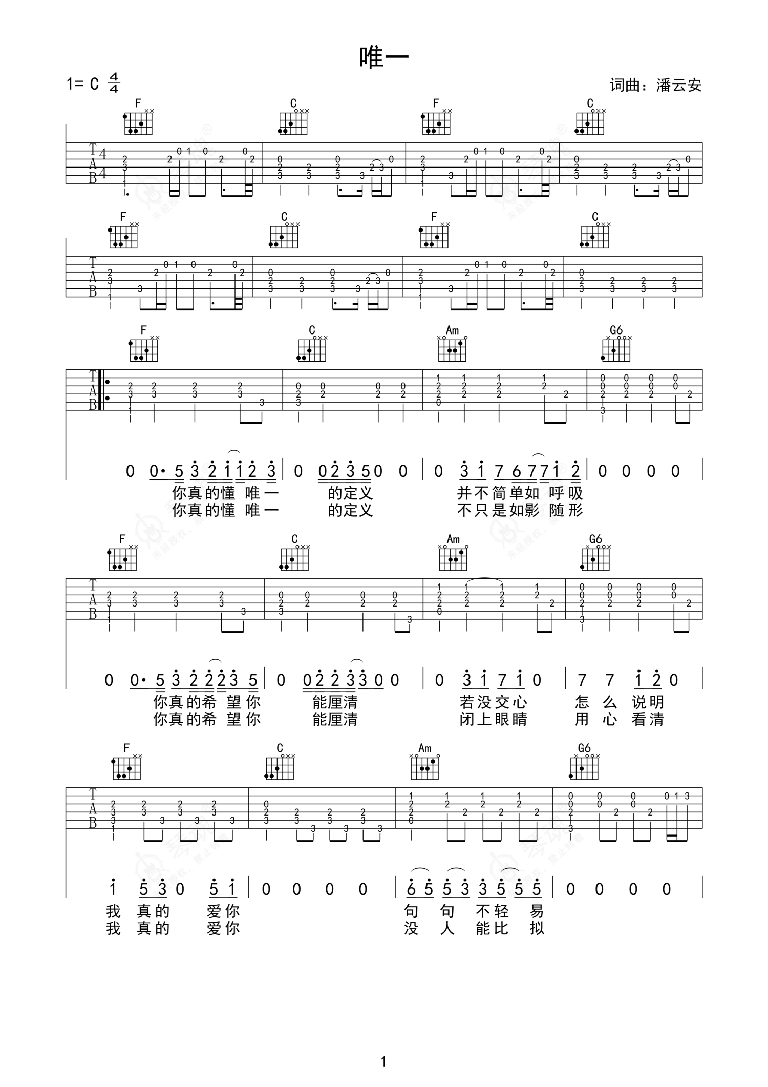 《唯一》是告五人演唱的一首歌曲,石头音乐编配版,拍号为4/4拍,歌曲原调为Db调,但由于原调指法比较难,为了方便弹奏,本吉他谱采用的是C调指法编配,变调夹1品弹奏即为原调,当然也可以根据自己的音域改变变调夹位置,或者通过改变和弦调性,以方便自己弹奏,这份吉他谱共有三张高清图谱,图谱由 @石头音乐 编配上传,图谱使用六线谱编配,包含吉他和弦指法、简谱以及歌词部分,使用这份唯一吉他谱,可以让你更加方便地掌握这首歌曲的弹唱技巧,快来尝试吧。