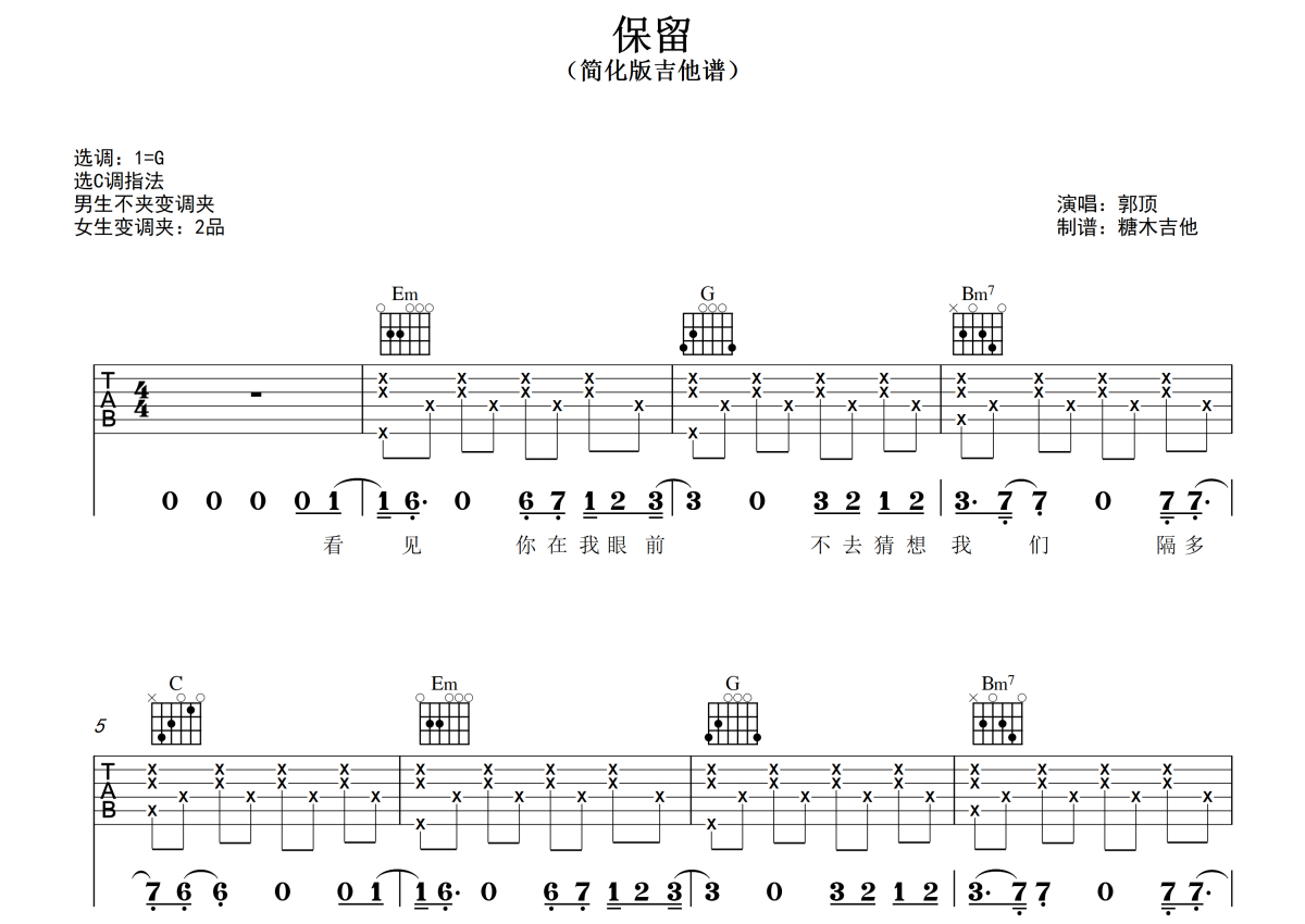 《保留》是郭顶演唱的一首歌曲,拍号为4/4拍,歌曲原调为G调,本吉他谱采用的是G调指法编配,演奏时不需要使用变调夹即为原调,这份吉他谱共有四张高清图谱,图谱由 @糖木吉他 编配上传,图谱使用六线谱编配,包含吉他和弦指法、简谱以及歌词部分,使用这份保留吉他谱,可以让你更加方便地掌握这首歌曲的弹唱技巧,快来尝试吧。对新手超友好的简化版吉他弹唱谱《保留》郭顶C调指法版 谱曲对应视频示范以及音频示范都可在抖音搜索(糖木吉他)观看 想要更多吉他谱,可在抖音和小红书搜索关注“糖木吉他” 或者添加老师微信“Tangmu2867 ”来获取更多简单弹唱的吉他谱和弹唱视频。