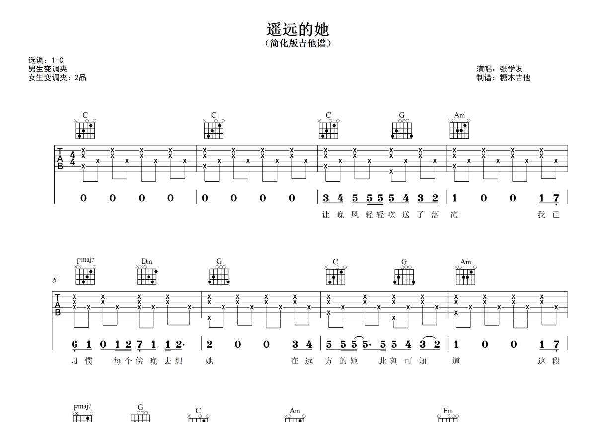 《遥远的她》是陈奕迅演唱的一首歌曲,这份吉他谱共有三张高清图谱,图谱由 @糖木吉他 编配上传,图谱使用六线谱编配,包含吉他和弦指法、简谱以及歌词部分,使用这份遥远的她吉他谱,可以让你更加方便地掌握这首歌曲的弹唱技巧,快来尝试吧。对新手超友好的简化版吉他弹唱谱《遥远的她》 陈奕迅 谱曲对应视频示范以及音频示范都可在抖音搜索(糖木吉他)观看 想要更多吉他谱,可在抖音和小红书搜索关注“糖木吉他” 或者添加老师微信“Tangmu2867 ”来获取更多简单弹唱的吉他谱和弹唱视频。