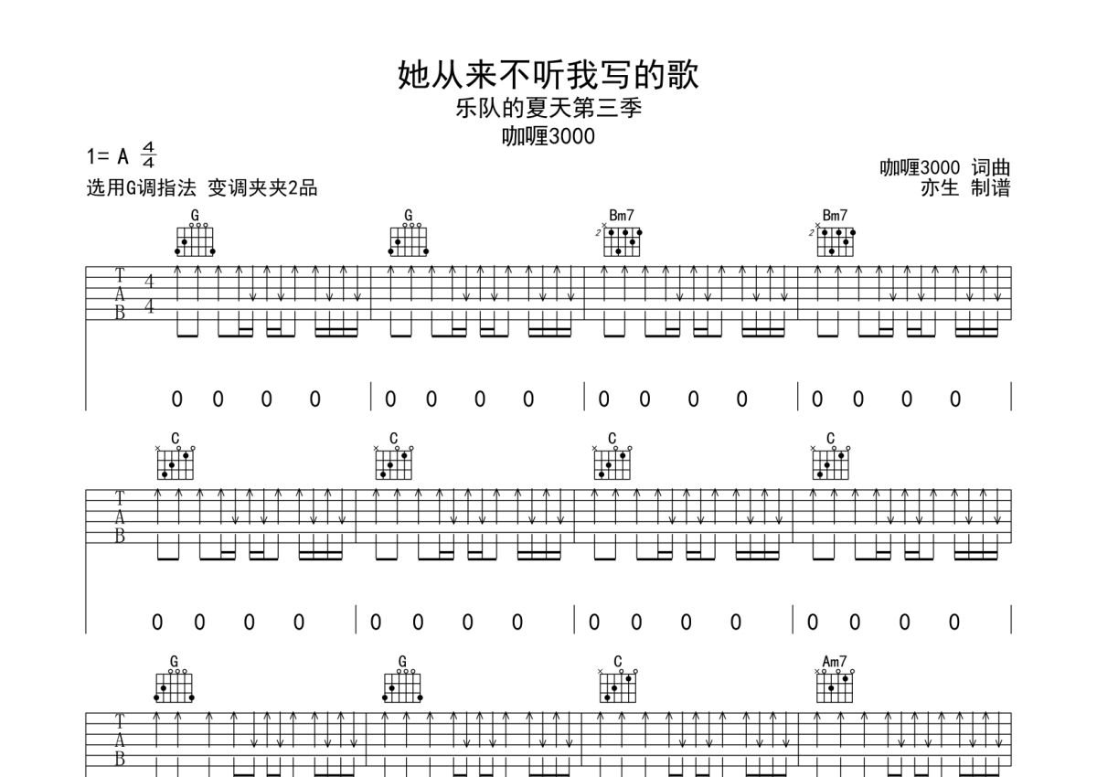 咖喱3000《她从来不听我写的歌》吉他谱 - G调弹唱六线谱