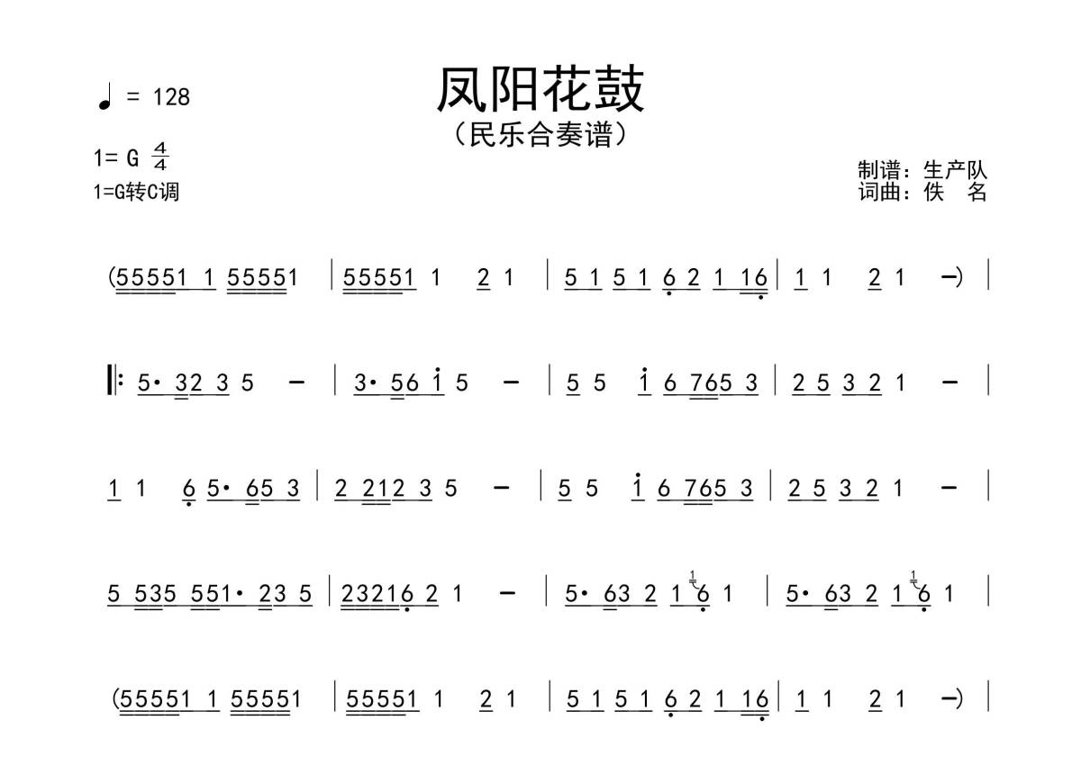 《凤阳花鼓》是纯音乐版演唱的一首歌曲,民乐合奏版,拍号为4/4拍,歌曲速度为每分钟128拍,这份简谱共有两张高清图谱,图谱由 @生产队 编配上传《凤阳花鼓》纯音乐版民乐合奏谱,根据原版G调转C调编配,一音不差版!。