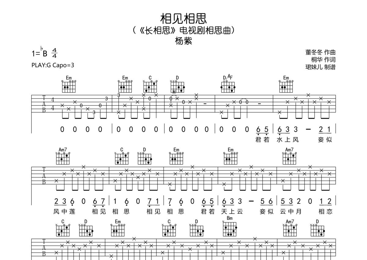 《相见相思》是杨紫演唱的一首歌曲,拍号为4/4拍,歌曲速度为每分钟85拍,歌曲原调为Bb调,但由于原调指法比较难,为了方便弹奏,本吉他谱采用的是G调指法编配,变调夹3品弹奏即为原调,当然也可以根据自己的音域改变变调夹位置,或者通过改变和弦调性,以方便自己弹奏,这份吉他谱共有两张高清图谱,图谱由 @珺妹儿 编配上传,图谱使用六线谱编配,包含吉他和弦指法、简谱以及歌词部分,使用这份相见相思吉他谱,可以让你更加方便地掌握这首歌曲的弹唱技巧,快来尝试吧。