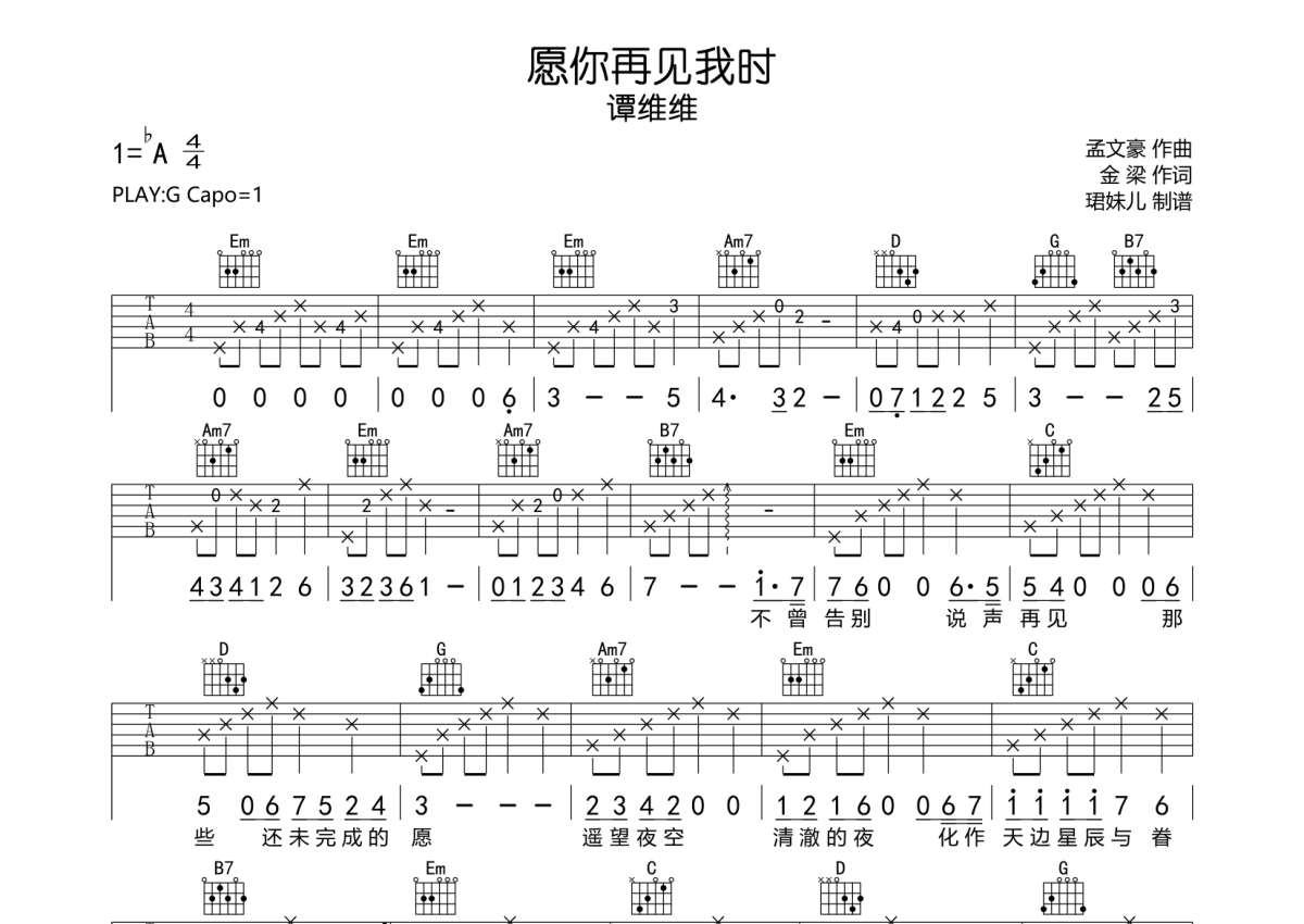 《愿你再见我时》是谭维维演唱的一首歌曲,拍号为4/4拍,歌曲速度为每分钟83拍,歌曲原调为Ab调,但由于原调指法比较难,为了方便弹奏,本吉他谱采用的是G调指法编配,变调夹1品弹奏即为原调,当然也可以根据自己的音域改变变调夹位置,或者通过改变和弦调性,以方便自己弹奏,这份吉他谱共有两张高清图谱,图谱由 @珺妹儿 编配上传,图谱使用六线谱编配,包含吉他和弦指法、简谱以及歌词部分,使用这份愿你再见我时吉他谱,可以让你更加方便地掌握这首歌曲的弹唱技巧,快来尝试吧。