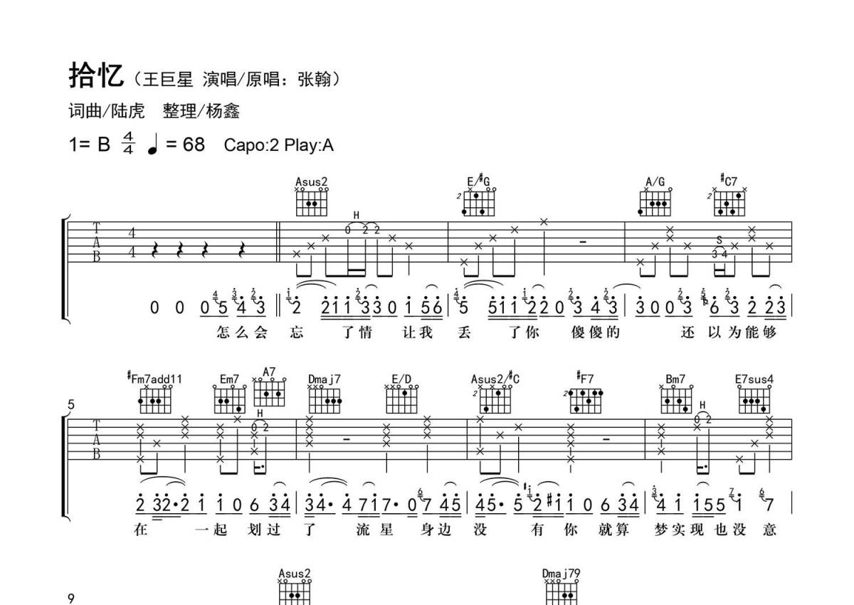 《拾忆》是王巨星演唱的一首歌曲,精编弹唱,拍号为4/4拍,歌曲速度为每分钟68拍,歌曲原调为B调,但由于原调指法比较难,为了方便弹奏,本吉他谱采用的是A调指法编配,变调夹2品弹奏即为原调,当然也可以根据自己的音域改变变调夹位置,或者通过改变和弦调性,以方便自己弹奏,这份吉他谱共有三张高清图谱,图谱由 @老杨教吉他 编配上传,图谱使用六线谱编配,包含吉他和弦指法、简谱以及歌词部分,使用这份拾忆吉他谱,可以让你更加方便地掌握这首歌曲的弹唱技巧,快来尝试吧。【编配情况】根据原曲精细整理。 【难点】不常用和弦的按法。 【技巧说明】H为击弦;S为滑音。