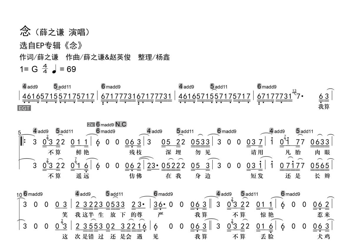 《念》是薛之谦演唱的一首歌曲,级数和弦标记,拍号为4/4拍,歌曲速度为每分钟69拍,这份简谱共有两张高清图谱,图谱由 @老杨教吉他 编配上传【歌曲信息】Key:G Tempo:4/4 每分钟69拍。 【整理信息】按原曲完整整理。 【和弦标记】数字级数。 【和弦难度】大、小三和弦,大、半减七和弦,加九和弦、加十一和弦,挂留和弦,五和弦(强力和弦)。