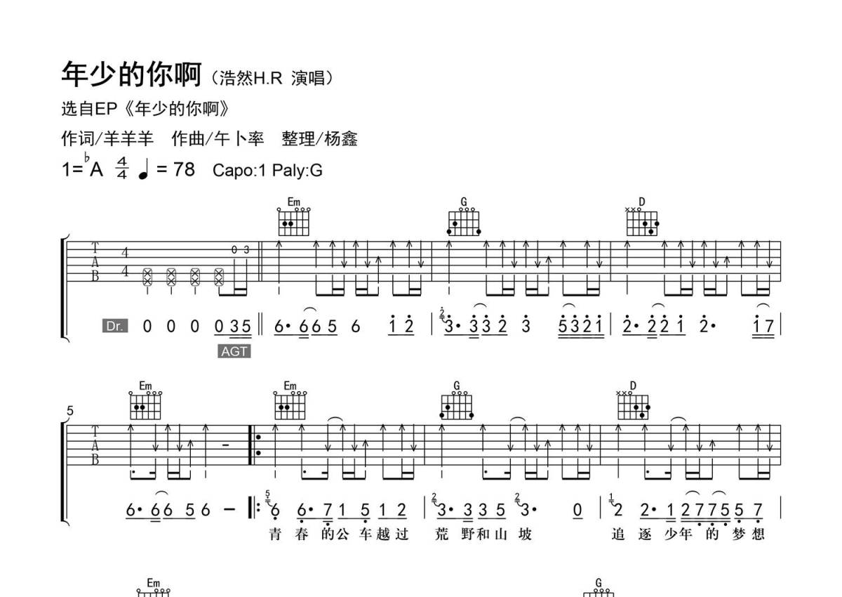 《年少的你啊》是浩然H.R演唱的一首歌曲,精编弹唱,拍号为4/4拍,歌曲速度为每分钟78拍,歌曲原调为Ab调,但由于原调指法比较难,为了方便弹奏,本吉他谱采用的是G调指法编配,变调夹1品弹奏即为原调,当然也可以根据自己的音域改变变调夹位置,或者通过改变和弦调性,以方便自己弹奏,这份吉他谱共有三张高清图谱,图谱由 @老杨教吉他 编配上传,图谱使用六线谱编配,包含吉他和弦指法、简谱以及歌词部分,使用这份年少的你啊吉他谱,可以让你更加方便地掌握这首歌曲的弹唱技巧,快来尝试吧。【编配情况】根据原曲精细整理。 【和弦难度】简单,无横按。 【节奏难度】最小时值16分音符,含附点、切分节奏,含拍弦与敲板技巧(可忽略)。 【难点】扫弦节奏的变化/敲板节奏。 【技巧说明】拨弦带框为【拍弦】(歌曲开头的起拍,可忽略);下标“+”为【敲板】(敲板为模仿鼓节奏:六弦拨弦带+为掌根敲击琴码下后方面板[模仿大鼓];1弦拨弦带+为食指中指无名指同时敲击吉他下后方侧板[模仿小鼓];5弦拨弦带+为左手食指中指无名指敲击6弦上方琴肩处的侧板[模仿通鼓];偏低音弦扫弦带+为中指与无名指下扫,同时用掌根敲击6弦上方面板;偏高音扫弦带+为中指与无名指下扫,同时用小指敲击1弦下方面板,31小节起右手参考指法:[掌根+中指+无名指]-[拇指]-[食指]-[小指+中指+无名指]-[拇指]-[食指]-[掌根+中指+无名指]-[拇指]-[食指]-[小指+中指+无名指]-[拇指]-[食指])。
